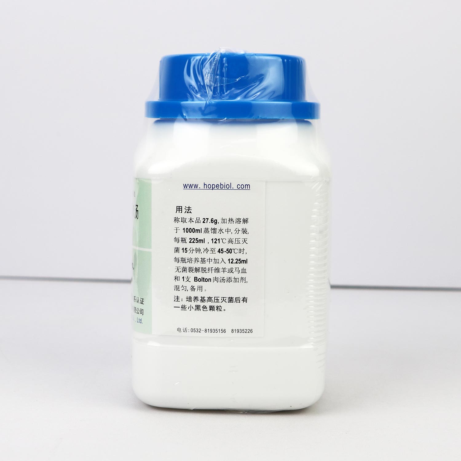 称取本品 27.6g,加热溶解于 1000ml 蒸馏水中,分装,每瓶 225ml ,121℃高压灭菌 15 分钟,冷至 45 -50℃时 ,每瓶培养基中加入 12.25ml 无菌裂解脱纤维羊或马血和 1支  Bolton 肉汤添加剂,混匀,备用。