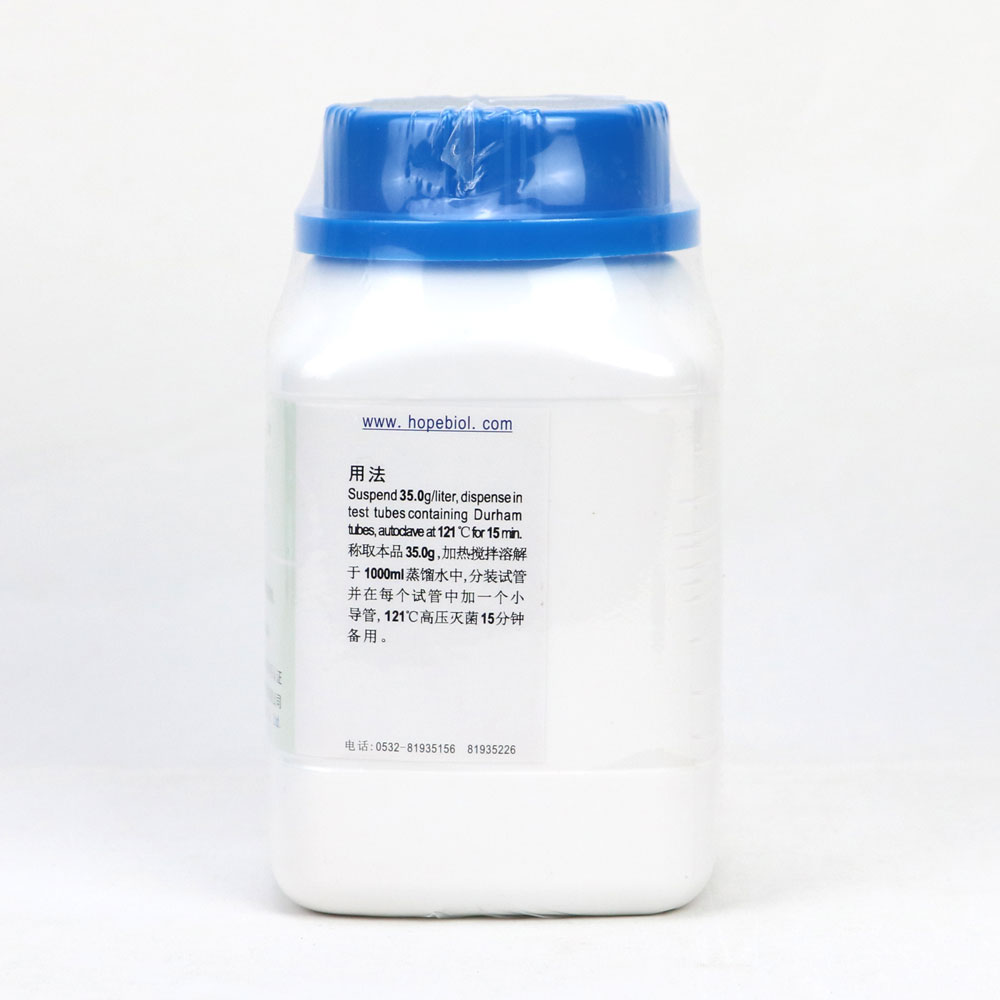 称取本品35克,加热搅拌溶解于1000ml 纯化水中,分装试管,并在每个试管中加一个小倒管,121℃高压灭菌15分钟,备用。