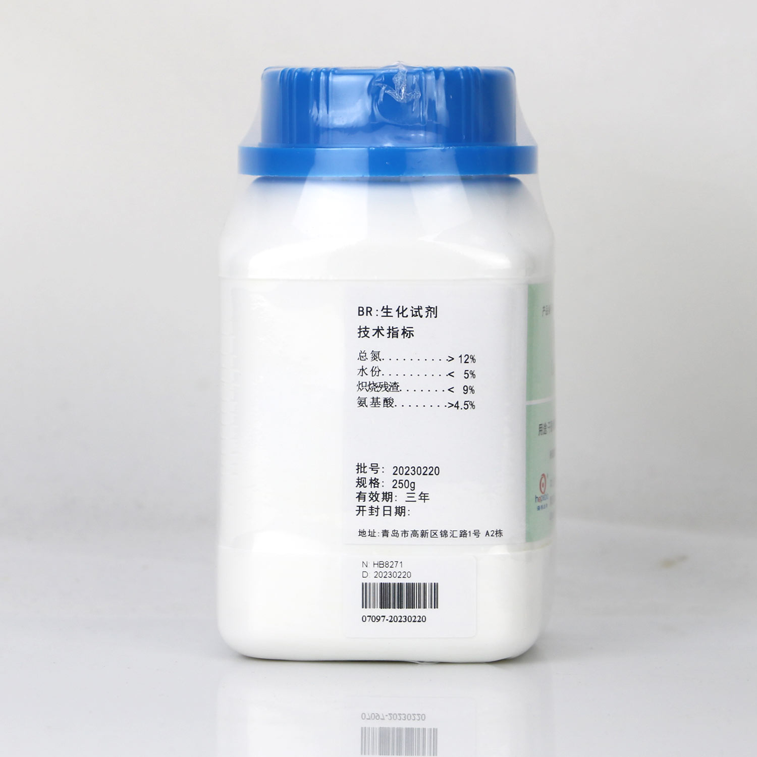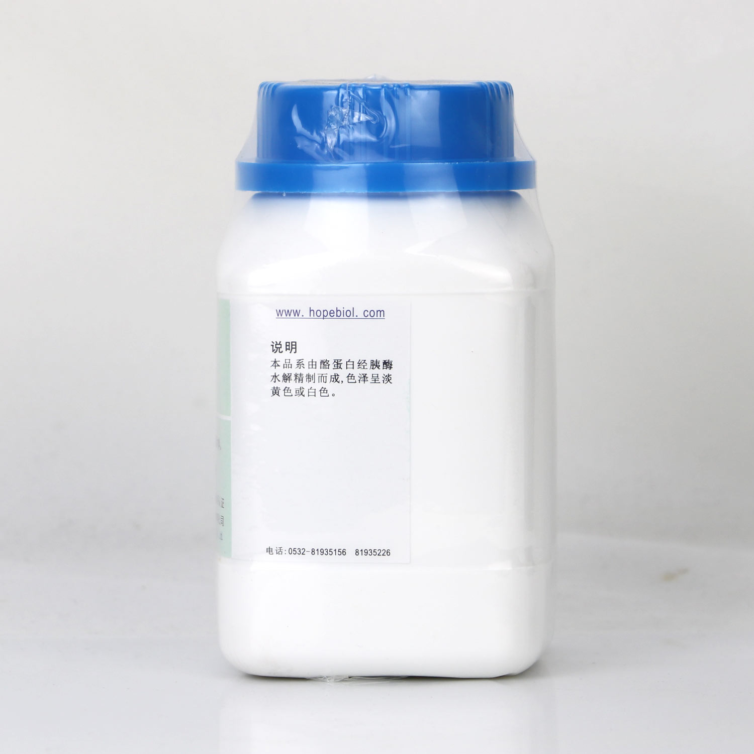 酪蛋白胨(胰酪胨)Tryptone又叫胰蛋白胨(进口),又称胰酪蛋白胨(Casein Tryptone)、胰酶消化酪蛋白(Pancreatic digest of casein),胰酶水解酪蛋白、胰酶水解酪素、胰酶水解干酪素等。是采用酪蛋白为原料,经过消化、脱色、过滤、浓缩、喷雾干燥而得到的一种浅黄色至类白色的干燥粉末。易溶于水,水溶液呈淡黄色。酪蛋白又称干酪素是从牛奶中提取的一种营养价值很高的磷蛋白,是生产蛋白胨常用的原料。用此原料生产的蛋白胨,其氨基酸比较齐全,特别是色氨酸的含量比较高。所以它在细菌生化试验中最适宜于做靛基质和糖发酵试验。但它缺乏胱氨酸、蛋氨酸等含硫氨基酸,故不适宜做硫化氢试验。总的来说,胰蛋白胨、酪蛋白胨、胰酪胨是否同种物料,主要看它们生产所用起始物料和水解工艺是否一致,如果一致,那就是同种物料;否则,不是同种物料。
