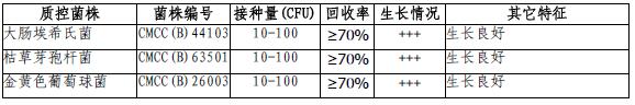 按标签用法制备培养基,接种以下质控菌株,放置36±1 ℃需氧培养18-24 小时。 注:回收率计算时,用TSA琼脂做对照培养基。