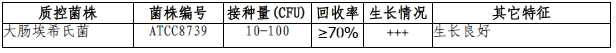 按标签用法制备培养基,接种以下质控菌株,放置36±1℃需氧培养18-24小时。 注:回收率计算时,用TSA琼脂做对照培养基。
