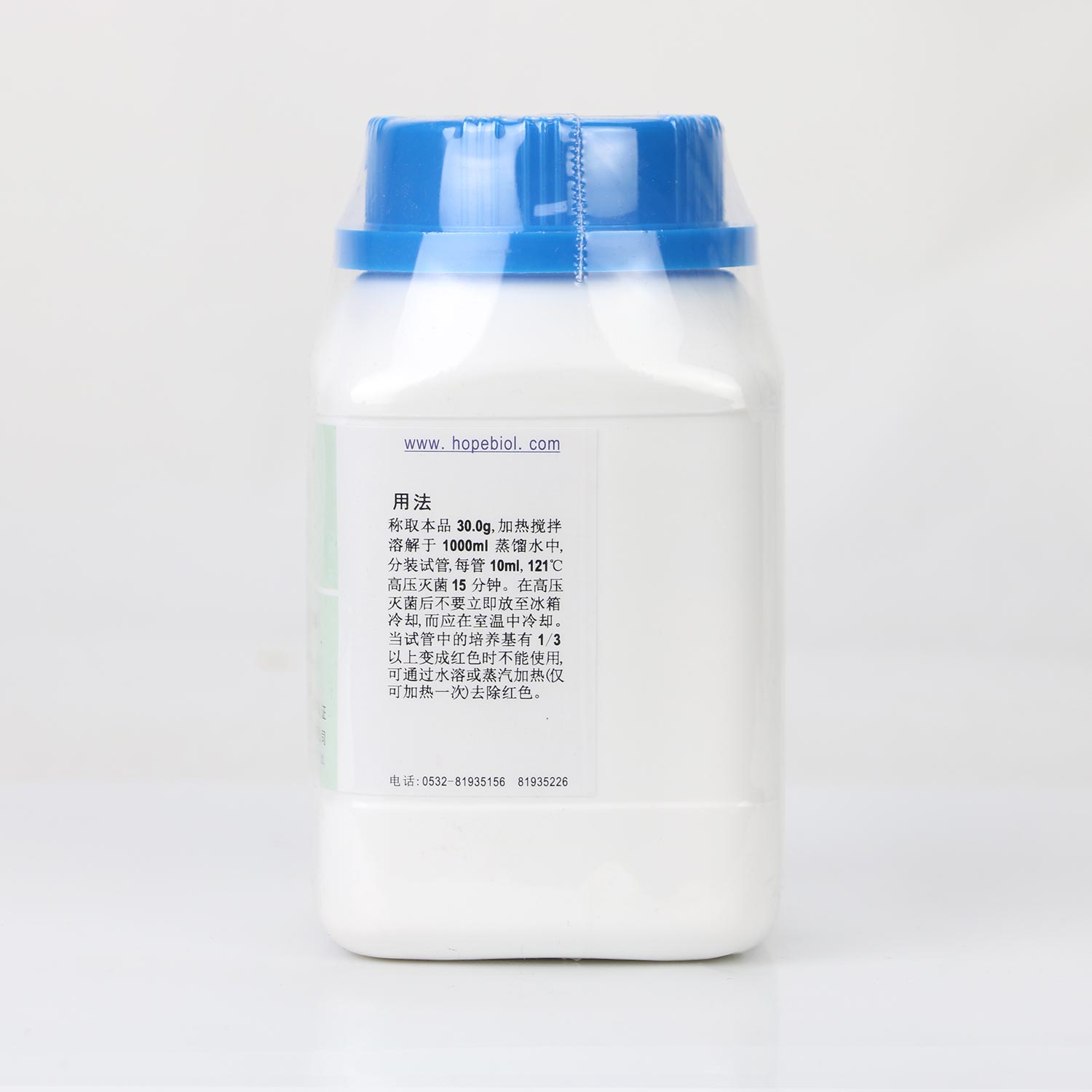 称取本品30.0g,加热搅拌溶解于1000ml蒸馏水中,分装试管,每管10ml,121℃高压灭菌15分钟。在高压灭菌后不要立即放至冰箱冷却,而应在室温中冷却。当试管中的培养基有1/3以上变成红色时不能使用,可通过水溶或蒸汽加热(仅可加热一次)去除红色。