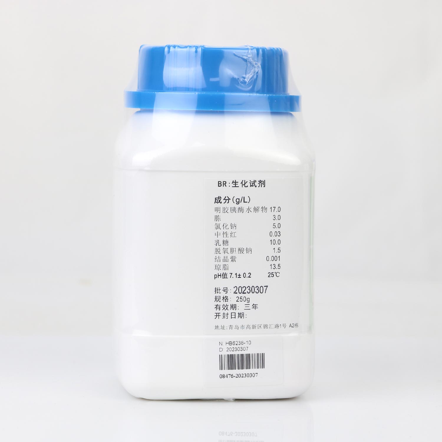 明胶胰酶水解物 17.0 胨(肉或酪蛋白) 3.0 氯化钠 5.0 中性红 0.03 乳糖 10.0 脱氧胆酸钠 1.5 结晶紫 0.001 琼脂 13.5 pH值7.1±0.2 25℃