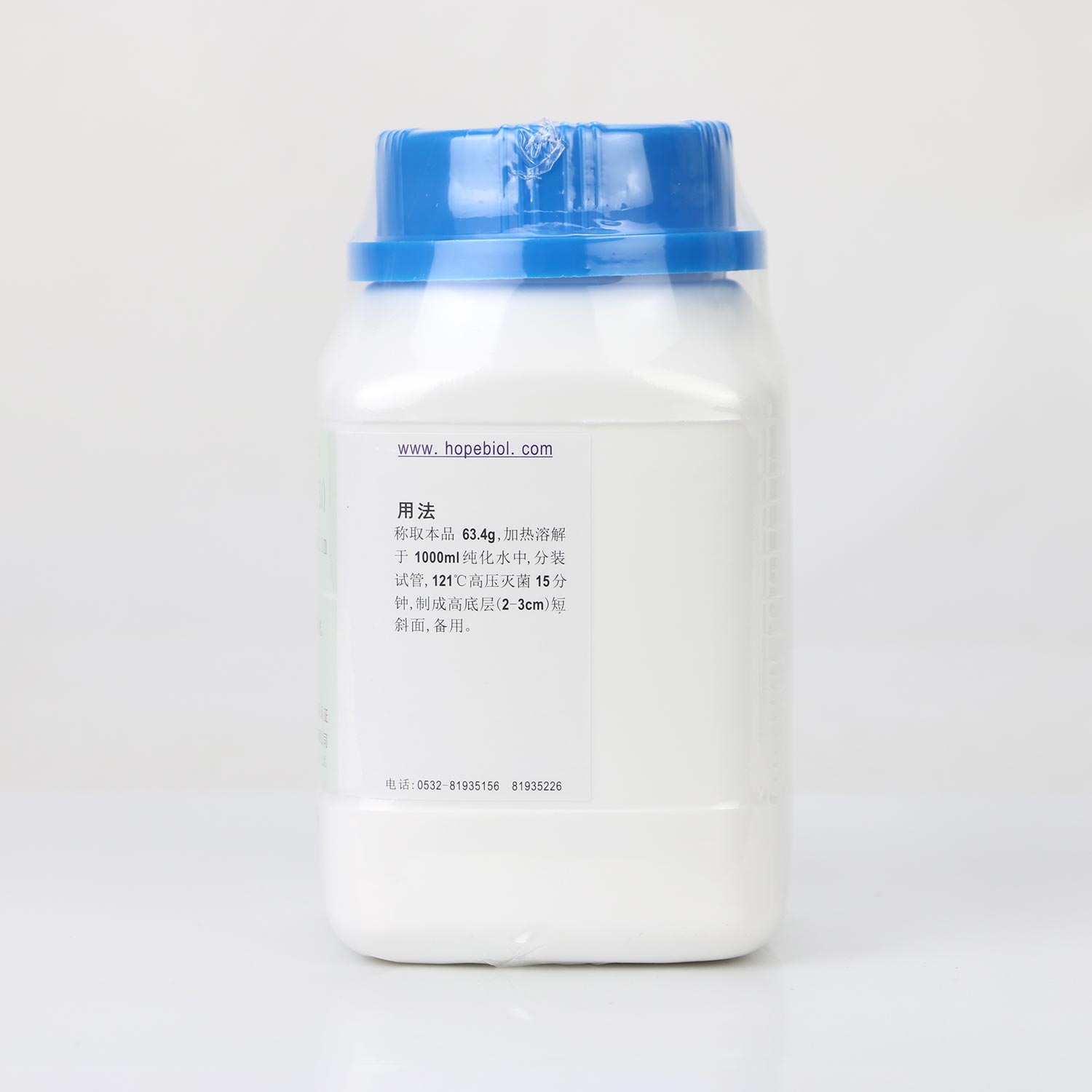 用法:称取本品63.4克,加热溶解于1000ml纯化水中,分装试管,121℃高压灭菌15分钟。制成高低层(2-3cm)斜面。备用。