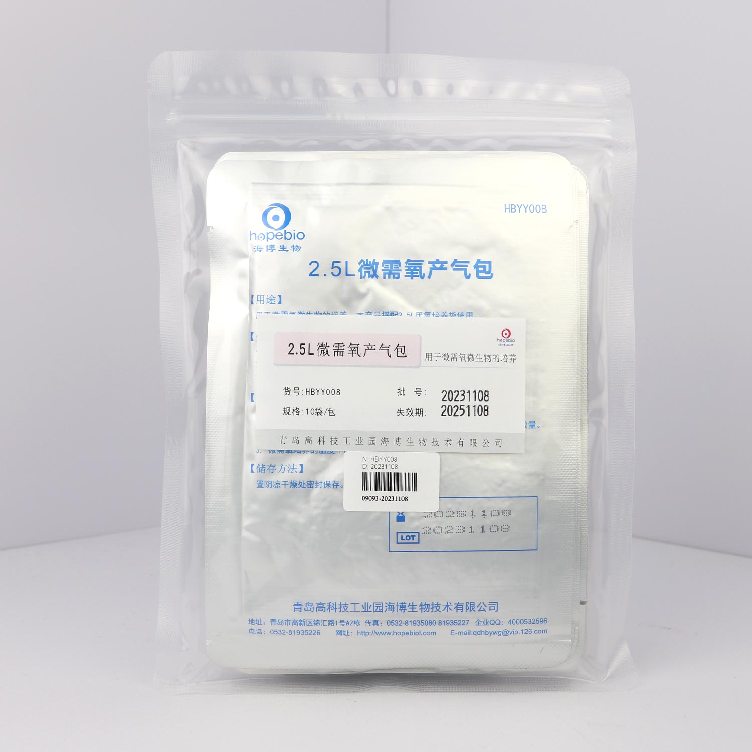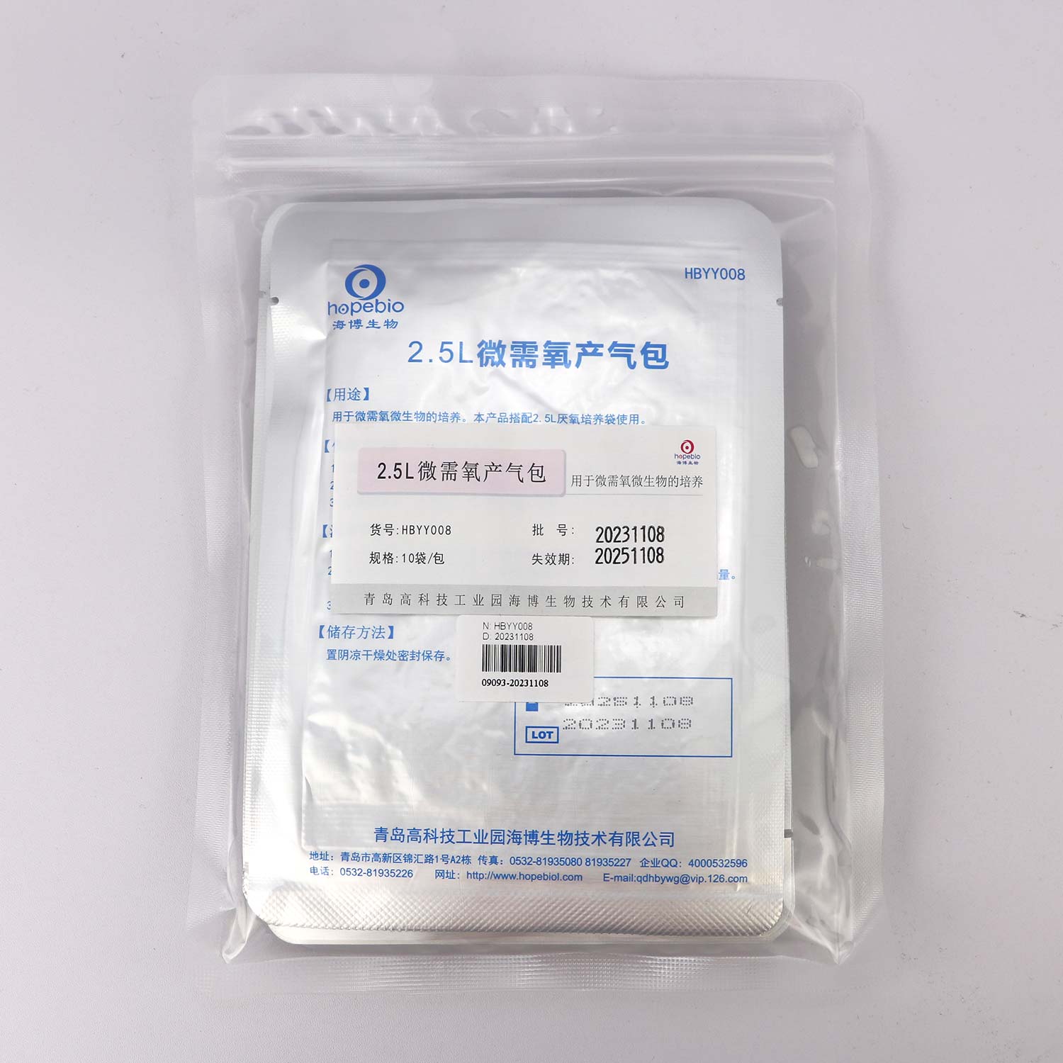 本品为2.5L微需氧产气包,用于为微生物微需氧培养构造微需氧环境。微生物微需氧/厌氧培养需要厌氧培养袋,微需氧/厌氧产气包,氧气指示剂配套使用,才可进行试验。