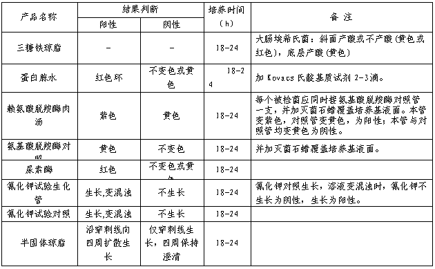 从弱选择性琼脂平板(EMB琼脂、麦康凯琼脂)上选取数个典型菌落或可疑菌落,划线接种到营养琼脂平板进行纯化培养(36±1℃培养18-24h),取纯化菌落接种到三糖铁琼脂、蛋白胨水、半固体琼脂、尿素酶、氰化钾、赖氨酸脱羧酶、氨基酸脱羧酶对照、氰化钾对照。其它的生化管是否进行接种,请参照GB/T4789.6-2003标准或WS271-2007标准的判断结果。