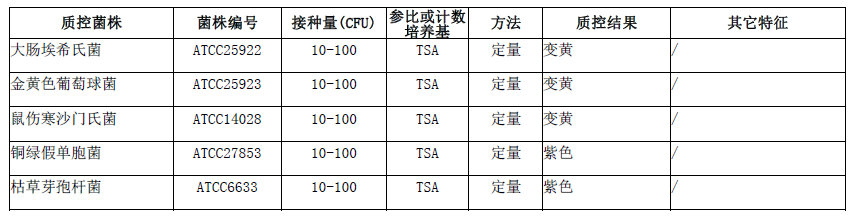 按标签用法制备培养基,接种以下质控菌株,放置35℃需氧培养40-48小时。