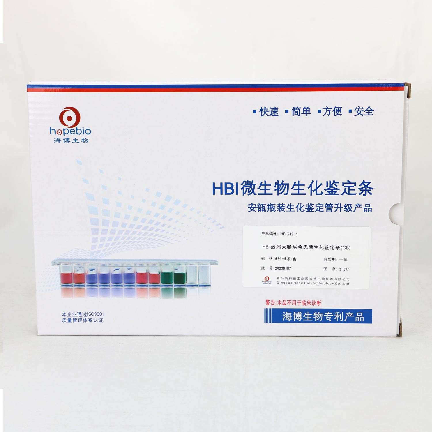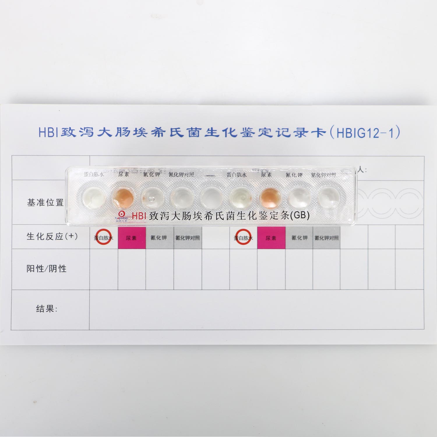 用于致泻大肠埃希氏菌的鉴定每条包括:三糖铁琼脂、蛋白胨水(色氨酸肉汤)、尿素酶、氰化钾试验生化管、氰化钾实验对照生化管、氧化酶共6种生化反应。(需Kovacs靛基质试剂、无菌液体石蜡)(GB4789.6标准)