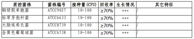 按标签用法制备培养基,接种以下质控菌株,放置30-35℃需氧培养120小时。 注:回收率计算时,用R2A琼脂做对照培养基。