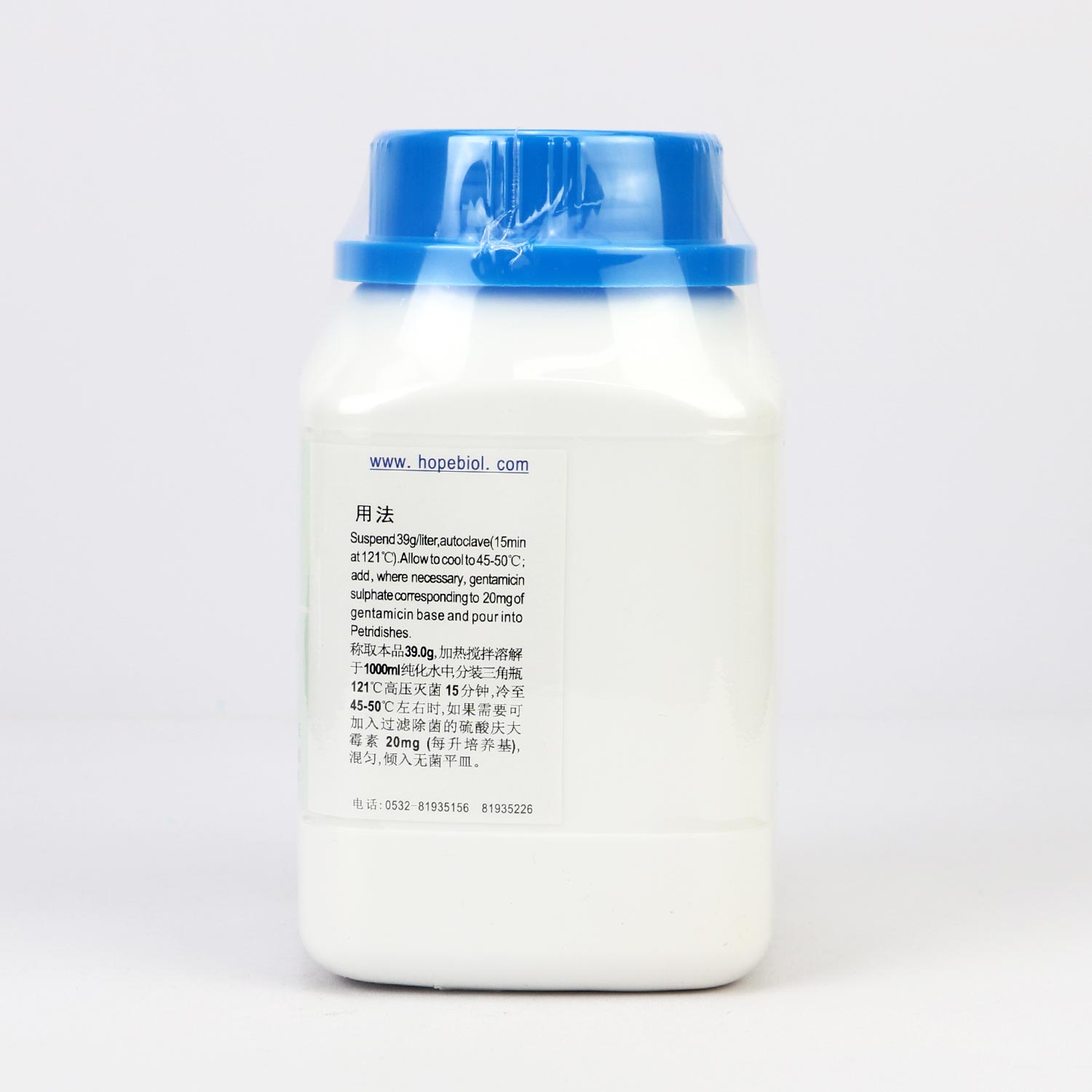 Suspend 39g/liter,autoclave(15min at 121℃).Allow to cool to 45-50℃;add ,where necessary,gentamicin sulphate corresponding to 20mg of gentamicin base and pour into Petridishes. 称取本品39.0g,加热搅拌溶解于1000ml纯化水中,分装三角瓶121℃高压灭菌15分钟,冷至45-50℃左右时,如果需要可加入过滤除菌的硫酸庆大霉素20mg (每升培养基),混匀,倾入无菌平皿。