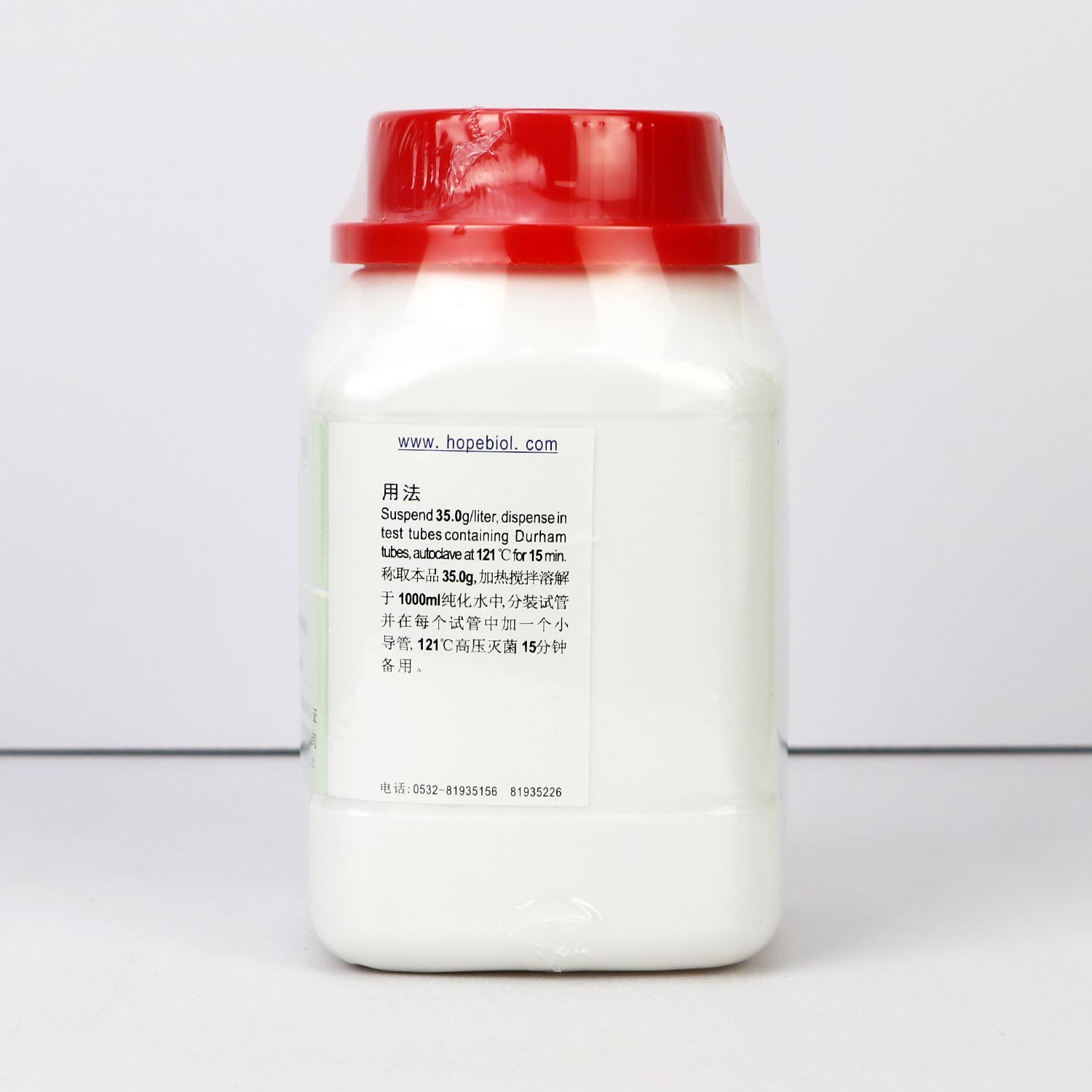 称取本品35克,加热搅拌溶解于1000ml纯化水中,分装试管,并在每个试管中加一个小倒管,121℃高压灭菌15分钟,备用。
