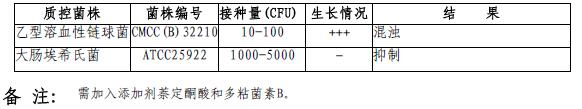 按标签用法制备培养基,接种以下质控菌株,放置36±1℃需氧培养18-24小时。