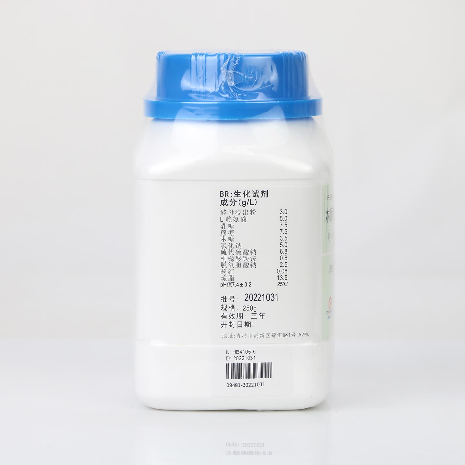 酵母浸粉 3.0 L-赖氨酸 5.0 乳糖 7.5 蔗糖 7.5 木糖 3.5 氯化钠 5.0 硫代硫酸钠 6.8 枸橼酸铁铵 0.8 脱氧胆酸钠 2.5 酚红 0.08 琼脂 13.5 pH值7.4 ± 0.2 25℃