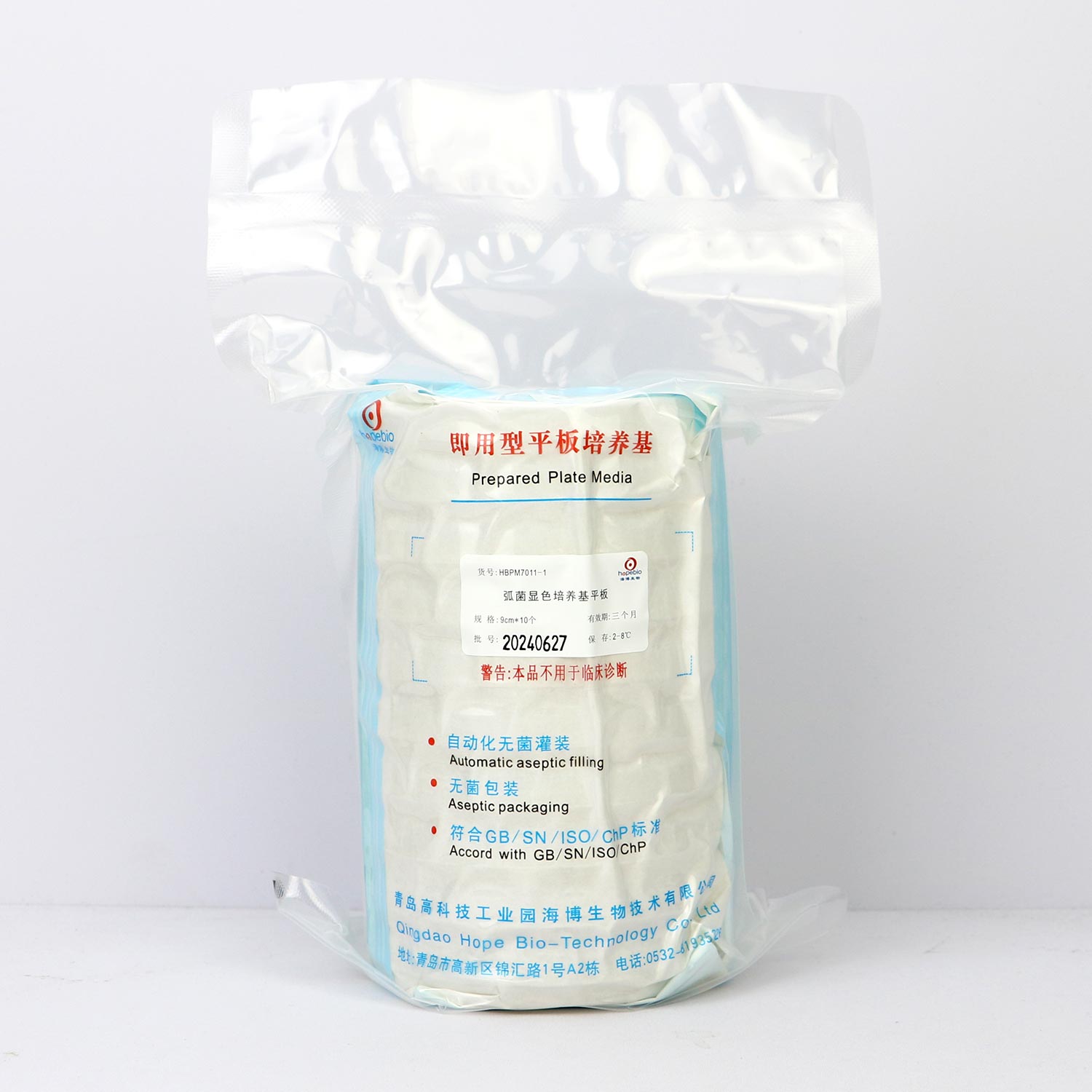 弧菌显色培养基是青岛海博生物公司改良的培养基,用于食品、海产品、病人粪便样品和水产品中副溶血性弧菌的快速检测。副溶血性弧菌显蓝绿色且菌落比较大,霍乱弧菌和创伤弧菌显紫红色,溶藻弧菌显淡黄色或米黄色;其它细菌绝大部分被抑制。本培养基的特异性高,可以克服TCBS培养基引起的假阴性结果,是一种很理想的快速检测培养基。