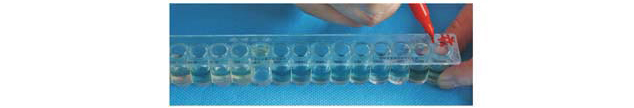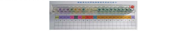 取一内盛2ml无菌水或无菌生理盐水试管,用接种针或接种环从营养琼脂平板上挑取单个菌落至无菌生理盐水中仔细研磨制成0.5麦氏浊度的均一细菌悬液,加入至V-P、柠檬酸盐、明胶、7%氯化钠、pH5.7、硝酸盐还原、淀粉水解孔内,每孔加入100ul菌悬液。