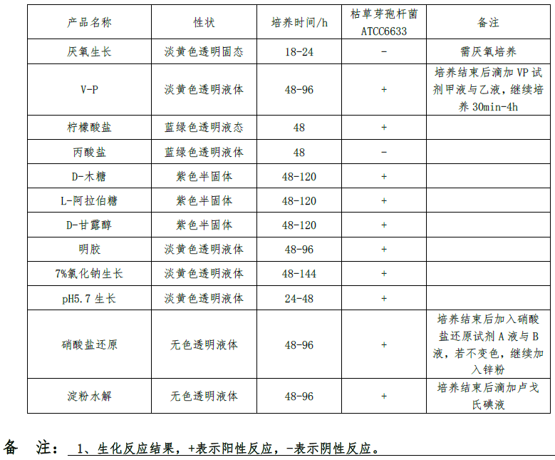 厌氧生长、V-P(需滴加V-P试剂盒)、柠檬酸盐、丙酸盐、D-木糖、L-阿拉伯糖、D-甘露醇、明胶液化、7%氯化钠生长、PH5.7生长、硝酸盐还原(需滴加硝酸盐还原试剂盒及锌粒)、淀粉水解。