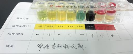 冻干菌种复苏接种至TSA平板。菌种活化后划线接种于李斯特氏菌显色平板和PALCAM平板,同时进行革兰氏染色镜检和李斯特氏菌生化条鉴定。