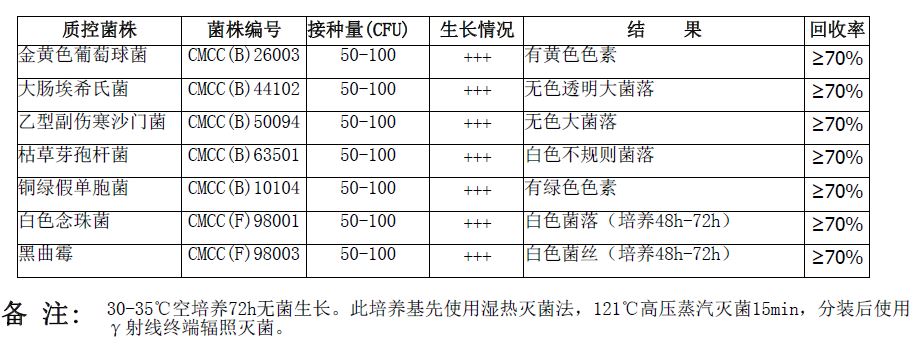 胰酪胨 15.0 大豆木瓜蛋白酶水解物 5.0 氯化钠 5.0 琼脂 15.0 pH值7.3±0.2 25℃