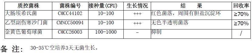 按标签用法制备培养基,接种以下质控菌株,放置35℃需氧培养18-72小时。
