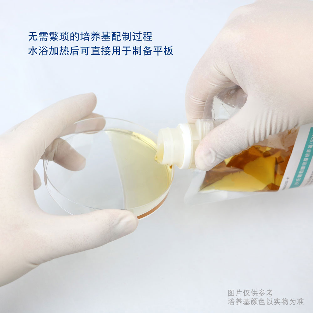 步骤4【无菌倾注】:在无菌环境下,撕开外层包装,拧开瓶盖,将培养基缓缓倾注至无菌平皿中,静置凝固后使用。
