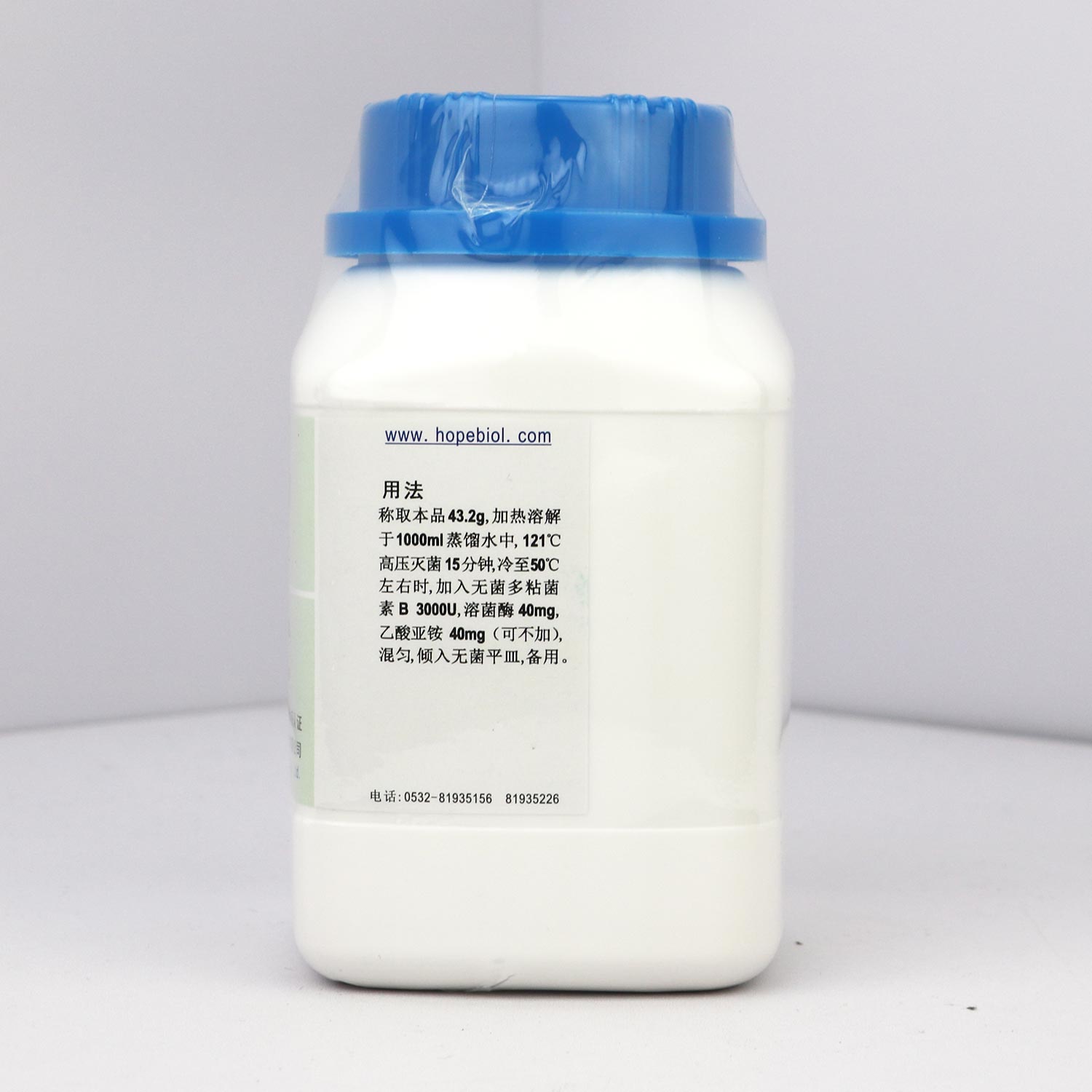 称取本品43.2g,加热溶解于1000ml蒸馏水中,121℃高压灭菌15分钟,冷至50℃左右时,加入无菌多粘菌素B 3000U,溶菌酶40mg,乙酸亚铵40mg(可不加),混匀,倾入无菌平皿,备用。