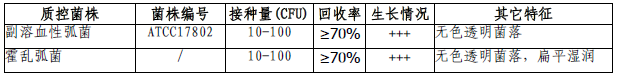 按标签用法制备培养基,接种以下质控菌株,放置36±1℃需氧培养18-24小时。 注:回收率计算时,用碱性琼脂做对照培养基。
