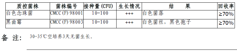 按标签用法制备培养基,接种以下质控菌株,放置20-25℃需氧培养72-120小时。 注:回收率计算时,用SDA 琼脂做对照培养基。