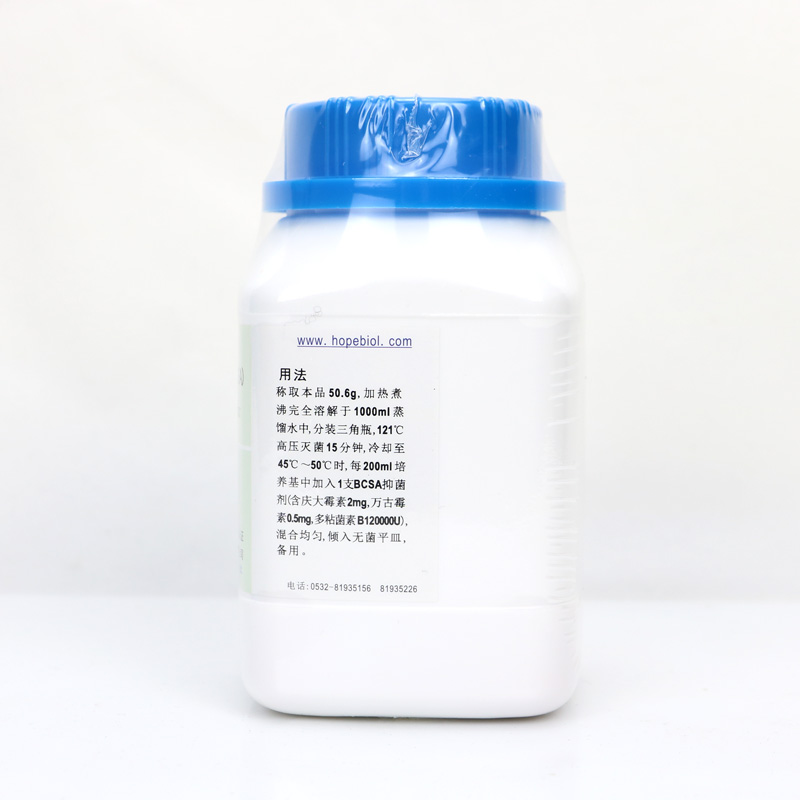 称取本品50.6g,加热煮沸完全溶解于1000ml纯化水中,分装三角瓶,121℃高压灭菌15分钟,冷却至45℃~50℃时,每200ml培养基中加入1支BCSA抑菌剂(含庆大霉素2mg,万古霉素0.5mg,多粘菌素B120000U),混合均匀,倾入无菌平皿,备用。