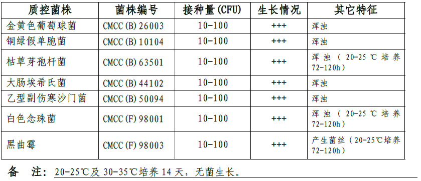 按标签用法制备培养基,接种以下质控菌株,放置30-35℃需氧培养18-24小时。