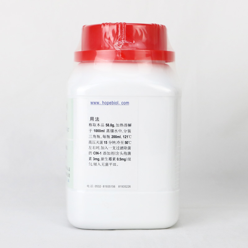 称取本品58.0g,加热溶解于1000ml蒸馏水中,分装三角瓶,每瓶200ml, 121℃高压灭菌15分钟冷至50℃左右时,加入一支过滤除菌的CIN-1添加剂(含头孢菌素3mg,新生霉素0.5mg)混匀,倾入无菌平皿。