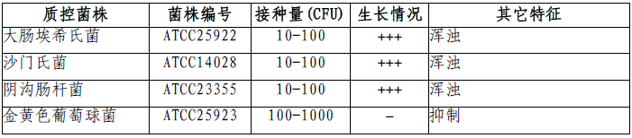 按标签用法制备培养基,接种以下质控菌株,放置36±1℃需氧培养18-24小时。