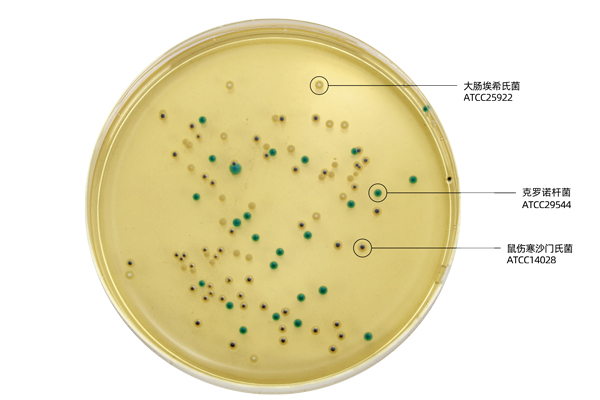 典型的克罗诺杆菌为蓝 -绿色菌落,其它菌为无色、乳白色或黄色菌落。
