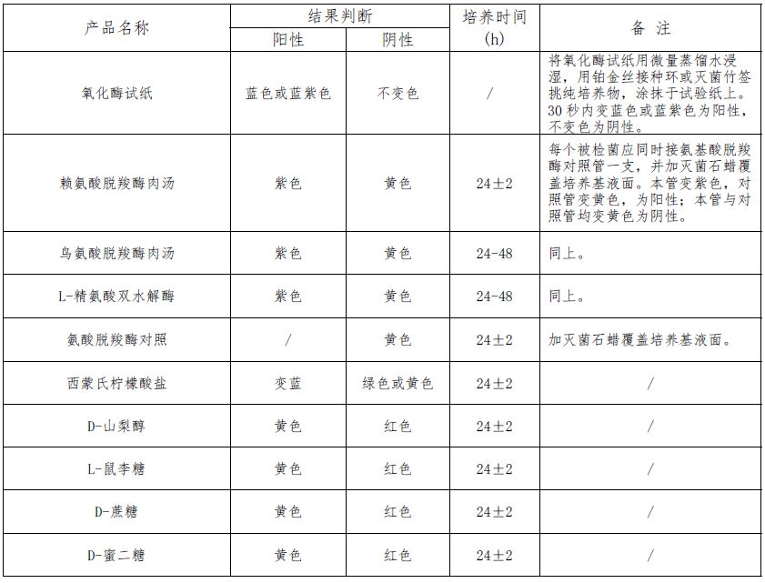 取TSA平板上直接挑取黄色可疑菌落进行氧化酶试验并分别接种赖氨酸脱羧酶肉汤、 鸟氨酸脱羧酶肉汤、 L-精氨酸双水解酶、氨酸脱羧酶对照、西蒙氏柠檬酸盐、 D-山梨醇、 L-鼠李糖、 D-蔗糖、 D-蜜二糖。请参照GB4789.40标准判断结果。