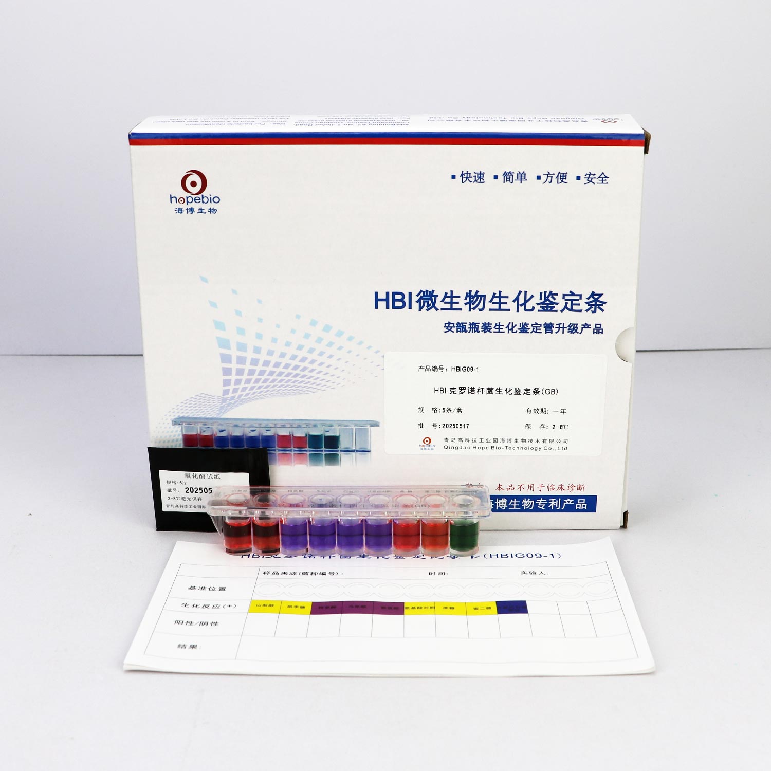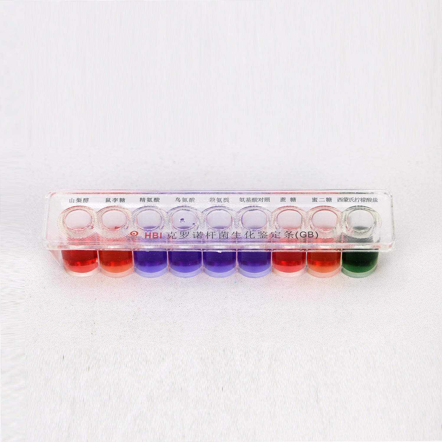 用于阪崎肠杆菌的生化鉴定,每条包括:氧化酶试纸,赖氨酸脱羧酶肉汤,鸟氨酸脱羧酶肉汤,L-精氨酸双水解酶,氨酸脱羧酶对照,西蒙氏柠檬酸盐,D-山梨醇,L-鼠李糖,D-蔗糖,D-蜜二糖,共10种生化反应。(GB标准)