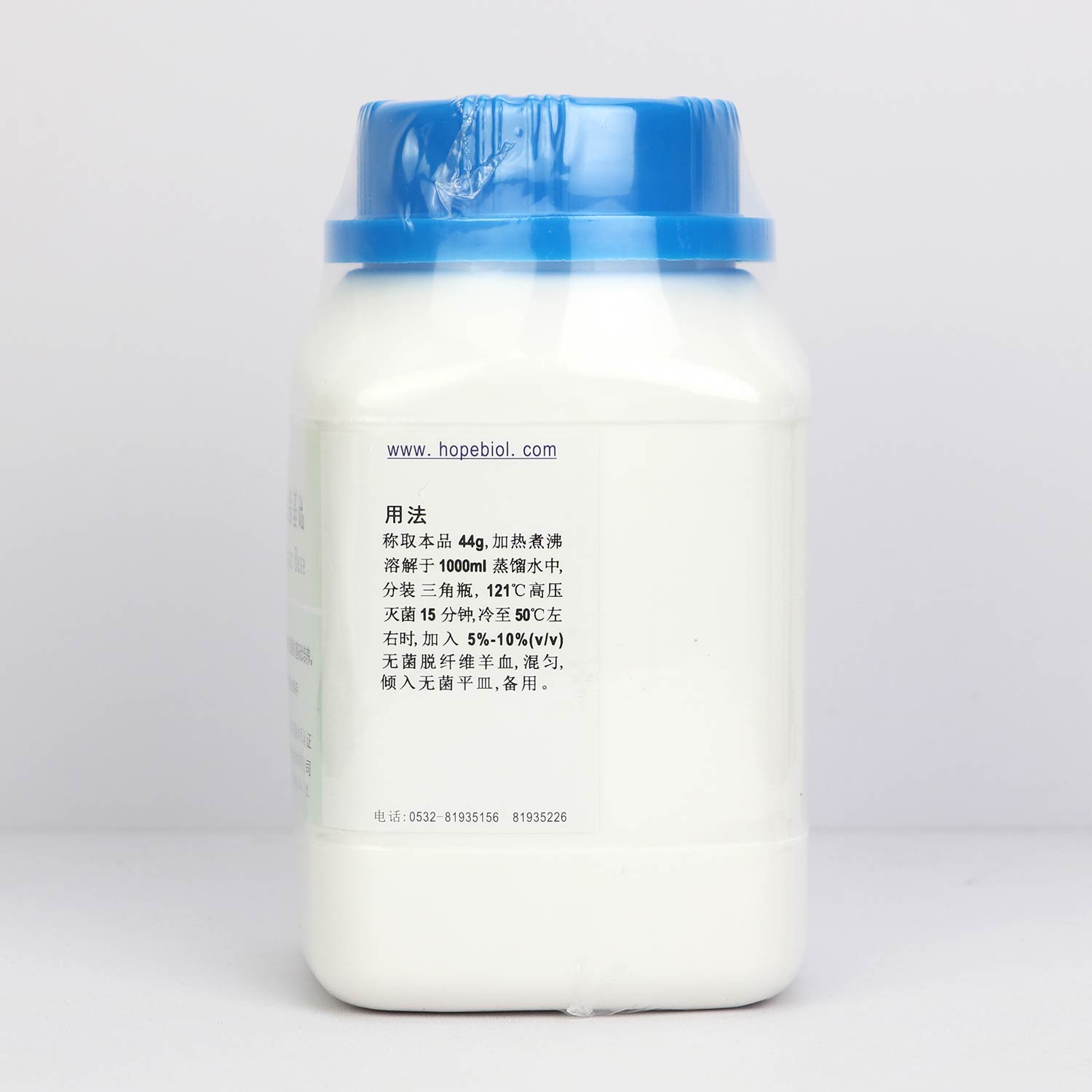 称取本品44g,加热煮沸溶解于1000ml蒸馏水中分装三角瓶,121℃高压灭菌15分钟,冷至50℃左右时,加入5%-10%(v/v)无菌脱纤维羊血,混匀,倾入无菌平皿,备用。