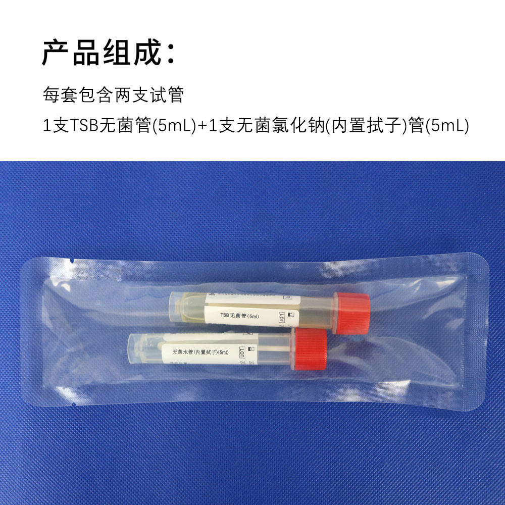 产品组成:每套包含1支TSB无菌管(5mL)+1支无菌氯化钠管(内置拭子)(5mL)