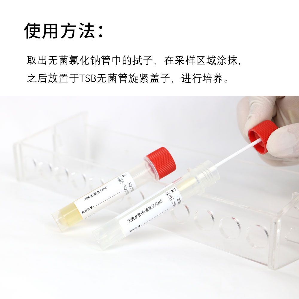 使用方法:取出无菌氯化钠管中的拭子,在采样区域涂抹,之后放置于TSB无菌管旋紧盖子,进行培养。