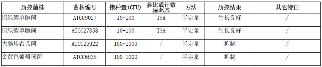 按标签用法制备培养基,接种以下质控菌株,放置36±1℃需氧培养18-24小时。