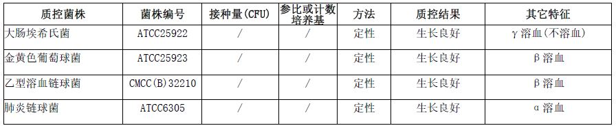按标签用法制备培养基,接种以下质控菌株,放置30-35℃需氧培养18-24小时。