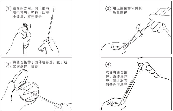2.取出斜面菌株,在无菌条件下,打开试管:沿箭头方向,向下推动安全锁块,轻轻下压安全锁块,盖子即可弹开。揭开试管盖子,使用无菌接种环挑取适量菌苔接种至适宜的固体或液体培养基,将培养基放置于适宜的条件下培养。