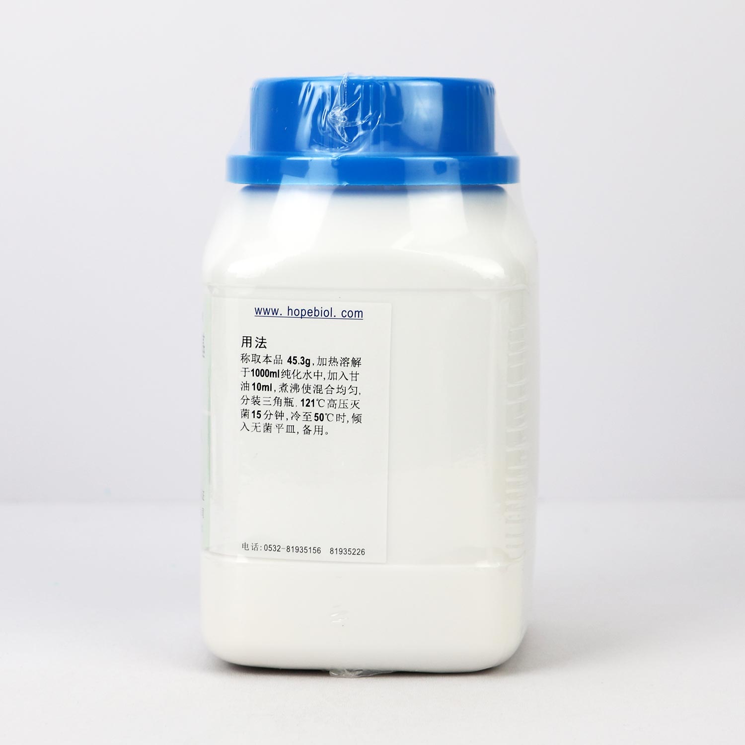称取本品45.3g,加热溶解于1000ml纯化水中,加入甘油10ml,煮沸使混合均匀,分装三角瓶,121℃高压灭菌15分钟,冷至50℃时,倾入无菌平皿,备用。