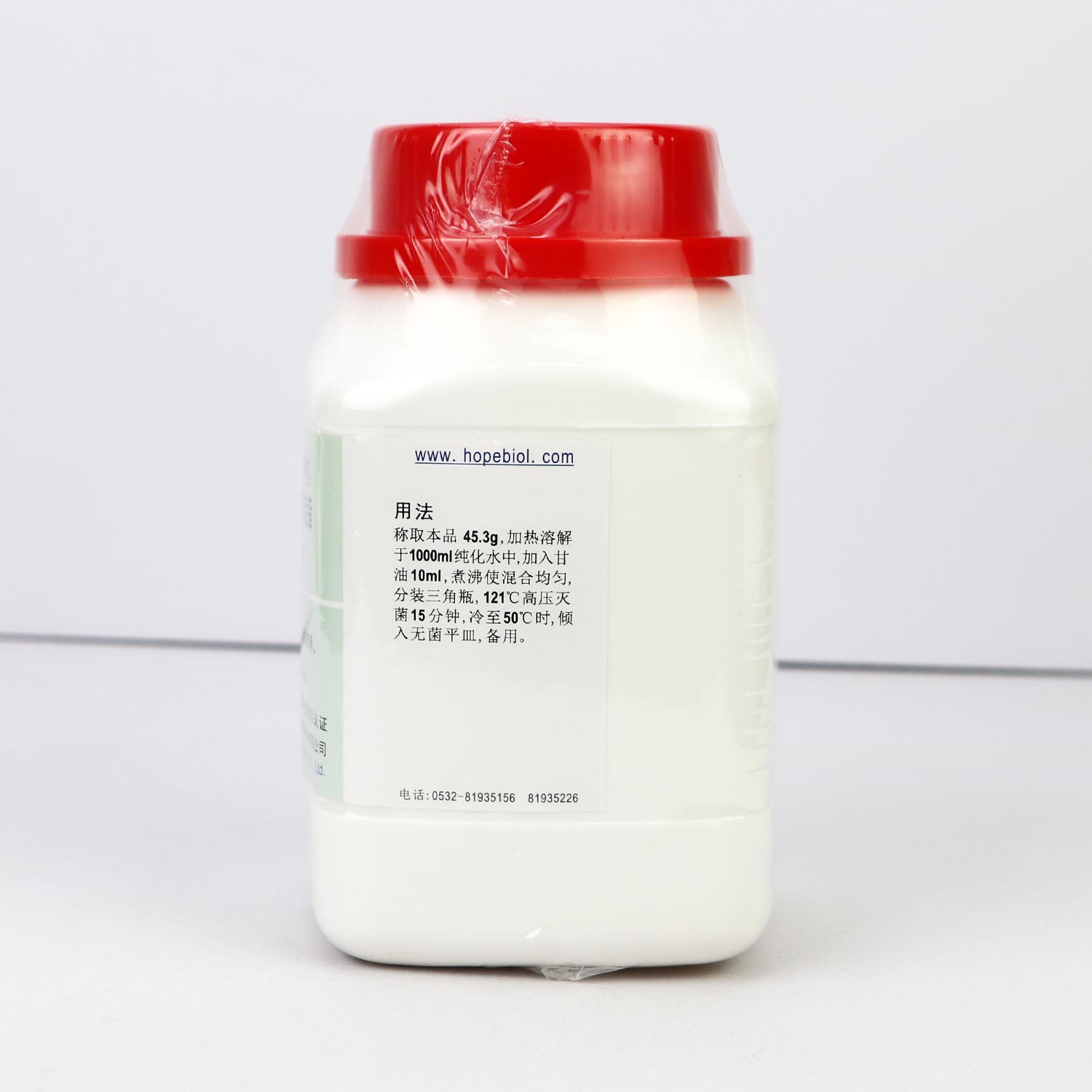 称取本品45.3g,加热溶解于1000ml纯化水中,加入甘油10ml,煮沸使混合均匀,分装三角瓶,121℃高压灭菌15分钟,冷至50℃时,倾入无菌平皿,备用。