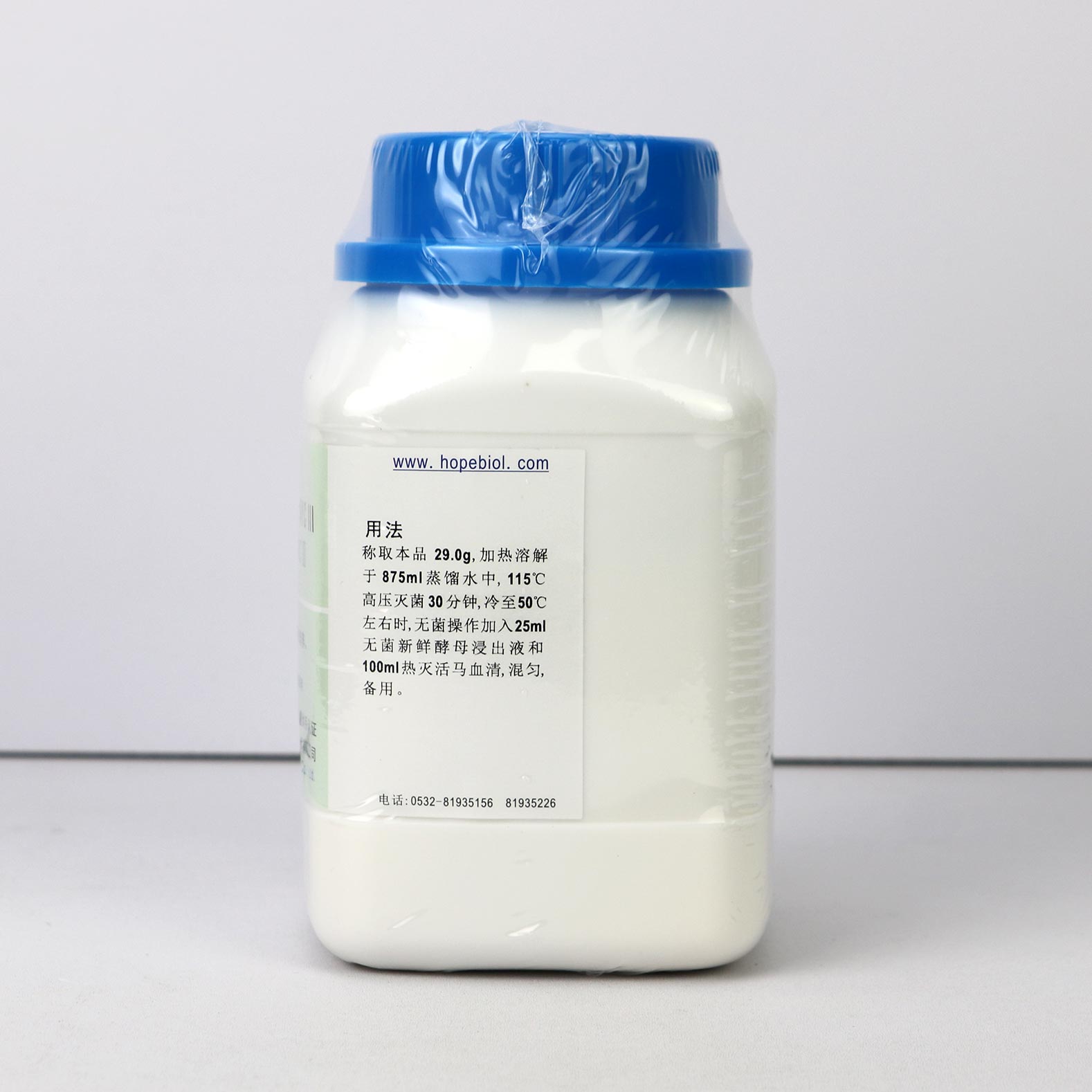 称取本品29.0g,加热溶解于875ml蒸馏水中,115℃高压灭菌30分钟,冷至50℃左右时,无菌操作加入25ml无菌新鲜酵母浸出液和100ml热灭活马血清,混匀,备用。
