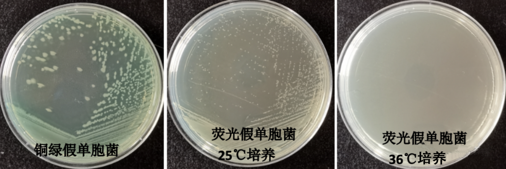 荧光假单胞菌36℃不生长,25℃生长良好,且为淡黄色菌落