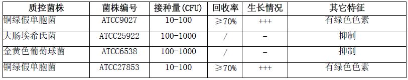 按标签用法制备培养基,接种以下质控菌株,放置36±1℃需氧培养18-24小时。