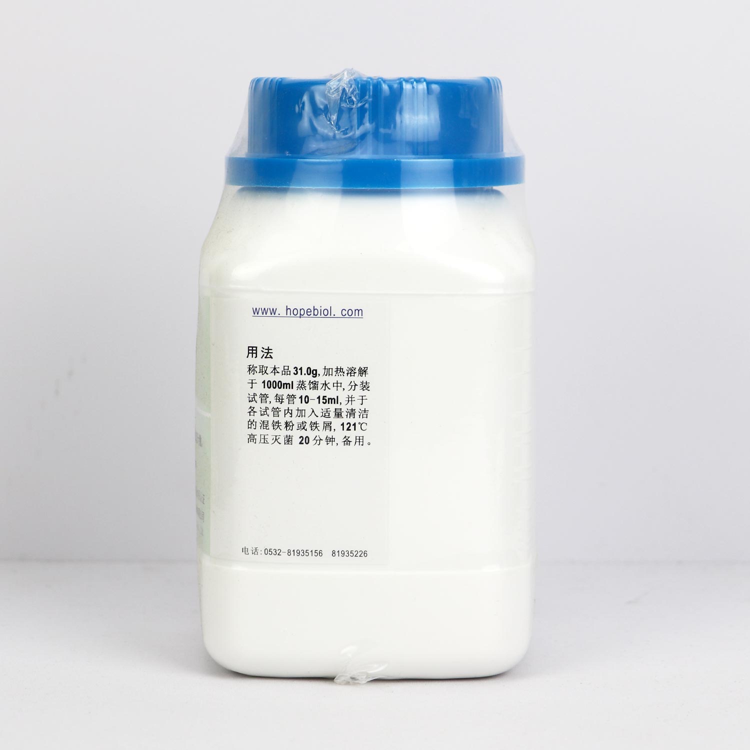 称取本品31.0g,加热溶解于1000ml蒸馏水中,分装试管,每管10-15ml,并于各试管内加入适量清洁的混铁粉或铁屑,121℃高压灭菌20分钟,备用。