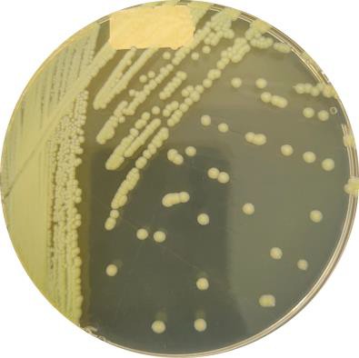 2. 麦康凯琼脂平板:浅黄褐色圆形菌落,表面光滑,周围培养基通常因产碱变为橙黄色(图2)。