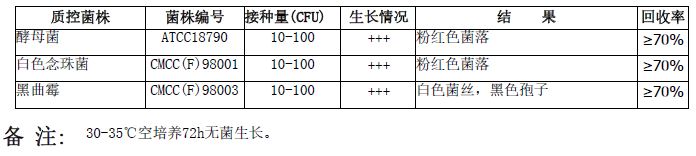 按标签用法制备培养基,接种以下质控菌株,放置20-25℃需氧培养48-120小时。