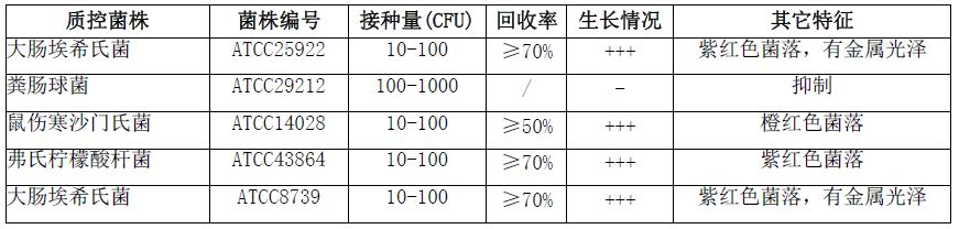 按标签用法制备培养基,接种以下质控菌株,放置36±1℃需氧培养24±2小时。