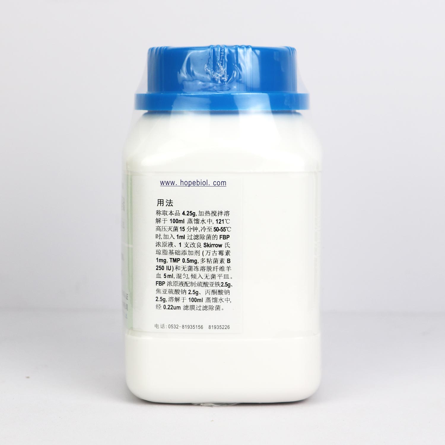 称取本品 4.25g,加热搅拌溶解于100ml蒸馏水中,121℃高压灭菌15分钟,冷至50-55℃时,加入1ml过滤除菌的 FBP浓原液、1 支改良Skirrow氏琼脂基础添加剂(万古霉素1mg,TMP 0.5mg,多粘菌素B 250IU)和无菌冻溶脱纤维羊血5ml,混匀,倾入无菌平皿。